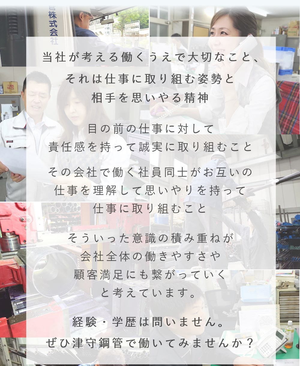 当社が考える働くうえで大切なこと、 それは仕事に取り組む姿勢と相手を思いやる精神 目の前の仕事に対して責任感を持って誠実に取り組むこと その会社で働く社員同士がお互いの仕事を理解して 思いやりを持って仕事に取り組むこと そういった意識の積み重ねが会社全体の働きやすさや 顧客満足にも繋がっていくと考えています。 経験・学歴は問いません。 ぜひ津守鋼管で働いてみませんか? 現在募集中:求人情報 現在募集中:求人情報 現在募集中の求人はございません。 現在募集中の求人はございません。
